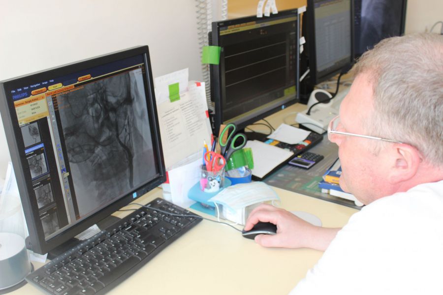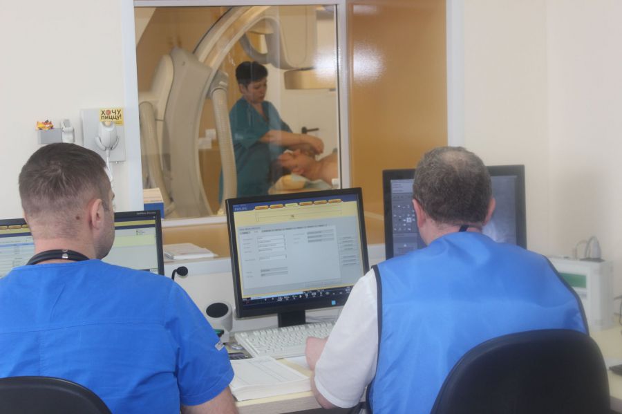 При госпитализации пациента с инсультом в стационар незамедлительно собирается мультидисциплинарная бригада врачей. Невролог определяет степень поражения головного мозга, рентгенолог обеспечивает искусственное кровоснабжение тканей при помощи мощного 128-срезового компьютерного томографа. В это время рентгенохирург через бедренную артерию вводит специальное устройство, с помощью которого из сосуда головного мозга извлекается закупоривший его тромб и при необходимости устанавливается стент.